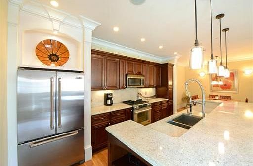 Superb craftmanship in this fantastic unit that boasts almost 1500SF. Huge open living, kitchen and dining room with a massive 10' island that seats 4 comfortably! The living room features a floor to ceiling custom stone fireplace with Metrie moulding. Huge living area is large enough for 10'-12"sectional and separate dining area can have table to seat 10-12 for those Holiday dinners. There is a huge guest bedroom splashed with sunlight and w/extra large closet. Guest bath features European Marble in shower w custom trim. The huge master suite is drenched in natural sunlight and features a Ritz-Carltonesque bathroom w jacuzzi and separate shower. There is also a private deck off the master suite. Current owner has recently built a trex deck on the first floor (has yet to be used). There are 2 private lighted storage areas that measure approx 120' SF of space. Last but not least is the heated garage that features 2 oversized parking spots. This unit has it ALL - DO NOT MISS THIS