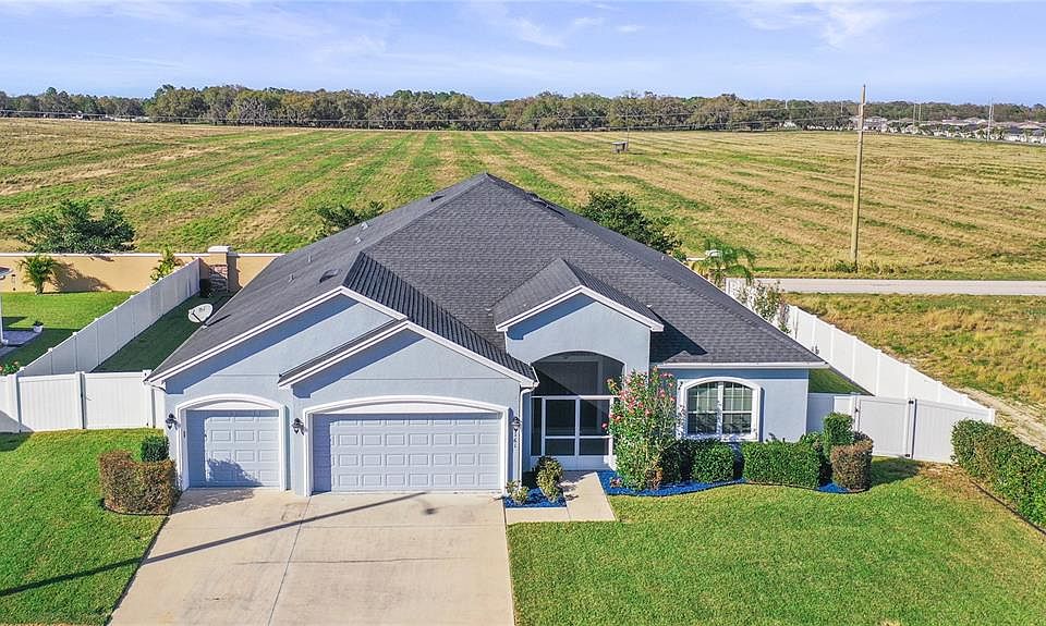 Welcome to 161 Viola, this spacious Windermere floorplan by Highland Homes features FIVE BEDROOMS, three bathrooms, and a THREE CAR GARAGE! Right off the bat, this home’s curb appeal is striking, with a HUGE YARD full of lush St Augustine grass, new mulch, tastefully designed landscaping, and a beautiful light blue paint. NEW EXTERIOR PAINT 2022!! The SCREENED FRONT PORCH offers double screen doors and double front doors making moving in big furniture a breeze. When entering the home you’re greeted by beautiful laminate wood floors and the spaciousness of the floor plan is immediately noticeable, including the large living room and two flex areas that are currently used for dining. ALL LAMINATE WOOD UPGRADED IN 2020!! This kitchen is great for entertaining, tons of counter space, open to the living area, and a breakfast bar for casual dining. The kitchen features 42” cabinets with unbelievable storage space, granite countertops, under cabinet lighting, and a brand new refrigerator! In the front of the house a hallway leads to two of the guest bedrooms and a guest bathroom, while near the entry is another bedroom that makes a great office, playroom, or so much more. The back of the home has another guest bedroom and a bathroom with easy access to the living areas, and a exterior door to the screened porch! Split from the rest of the bedrooms is the large master bedroom featuring a double door entry, tons of natural light, and a sliding class door to the back porch. The master bathroom offers dual sinks, a stall shower, garden tub, and HUGE walk-in closet! Now on to the FULLY FENCED back yard! A screened porch, huge 8-PERSON HOT TUB, no rear neighbors, large gates on both sides, and rubber mulched area ready for a playground or fire pit, the backyard is perhaps one of this home’s best features! Additional features include HURRICANE SHUTTERS, attic with pull down ladder and plywood storage area, in wall pest control system, and rain gutters. Additional energy efficient upgrades from builder include attic radiant barrier and insulated cinder block fill.