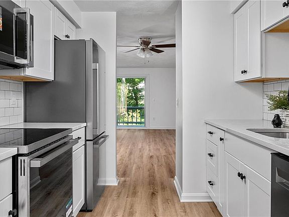 Step into this completely renovated townhome and experience modern luxury at its finest. The sleek stainless steel appliances gleam in the brand new kitchen, complimented by stunning Quartz countertops and a subway tile backsplash. Both bathrooms have been elegantly designed with a modern touch, featuring all new fixtures and finishes. The new black hardware throughout the home adds a touch of sophistication, while the luxury vinyl plank flooring in island oak light creates a warm and inviting atmosphere. The spacious master bedroom boasts a walk-in closet and a cozy nook perfect for remote working, set in front of a Juliette balcony for a touch of elegance. Natural light floods the bedrooms through skylights, while ample closet space provides plenty of storage options. The higher Than a crawl space super clean basement offers even more storage space, keeping your home clutter-free. Stay comfortable year-round with central AC, and enjoy the soft carpeting in the upstairs bedrooms. Entertain guests on the spacious deck or simply relax and enjoy the serene surroundings of the well-maintained Twin Oaks community in the Hoxie area. With laundry on the first floor, two assigned parking spaces, and a turnkey move-in ready status, this townhome truly has it all. Don't miss out on this rare opportunity to own a piece of luxury in a small, quiet community.