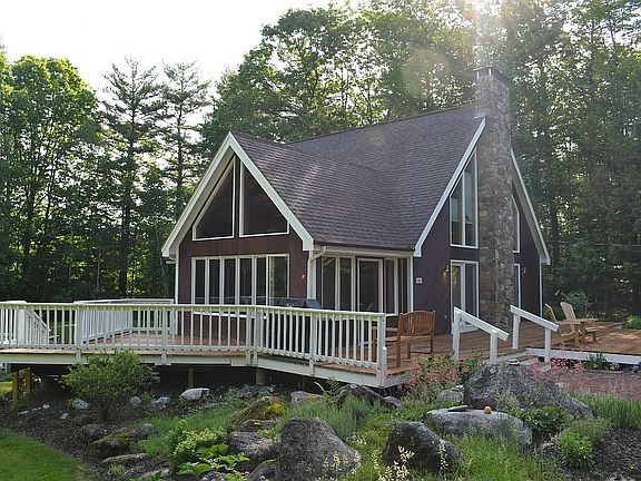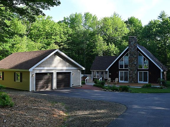 Located in the westerly side of Meredith. This classic chalet style home is 1/2 mile from Lake Waukewan beach and 1.2 miles to downtown Meredith. Refreshed interior mechanical systems and interior and exterior improvements. This 2-bedroom home with 1.5 baths. Newer kitchen with Maple Kraft Maid cabinets featuring "soft close" doors and drawers, beautiful black granite countertops with stainless under-mount sink and garbage disposal. stainless steel appliances: Electrolux double oven, induction cook-top, Kitchen aid French door refrigerator, under-counter microwave oven, glass tile backsplash. Pecan flooring. Newer remodeled bath with similar cabinets and countertops, double sinks and ceramic tile surround and floor, huge walk-in shower complete this over-sized bath. Recent waterproof plank vinyl flooring added to main living area of the home. Field stone fireplace and chimney that was completely serviced and refurbished with a stainless-steel cap, twin French doors leading to a sun-drenched refurbished cedar deck that overlooks the mature seasonal flower beds and rock gardens that surround the entire property and newly paved driveway. Back inside, Open stairs lead from main room to balcony and huge 2nd floor bedroom with outdoor balcony where you can enjoy your morning coffee watching the sunrise. This upper room can be used as an exceptionally large bunk-room for family and guests or a master bedroom with a potential added master en-suite bath or multiple bedrooms. First floor bedroom has walk-in closet. Also, a newly created closet next to bath. Entry to the home is through a sun filled 3 season porch with vaulted pine ceiling with exposed beams and ceramic tile flooring. In addition to a newly installed 4 zone/baseboard oil fired furnace with superstore water heater, the home has recently had 3 zone Mitsubishi Split AC/Heat units installed which cool and heat with great efficiency. The lower-level walkout of the house is the classic definition of a "Man Cave” including a granite top bar and brass foot rail. Lots of built in shelving and closet space as well. A half bath with laundry, wine cellar and sink area as well. The exterior of the home has had the deck completely restored and coated with Australian Timber Oil and freshly painted trim on the railings and entire house. Anderson windows compliment the exterior look. An additional detached platform deck behind the home awaits the hot tub or cabana of your dreams. The house features a newly resided and oversized 2 car garage with it's own sub panel to power any of your hobbies in the ample workshop space. The second level of the garage has an incredible attic to keep all your Xmas decorations or yard furniture during the off season. A truly quintessential NH getaway home! Come and live in the heart of the Lakes Region with many lakes and ski areas within an hours ride. Also there is a corridor snowmobile trails at the top of the street. You do not want to miss this opportunity! Shown by appointment only! Please refrain from entering driveway without pre-arranged showing due to dog! Sale subject to seller obtaining suitable housing or rent-back option. Principle parties only please!