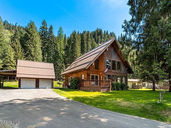 Escape to your mountain retreat! This charming 2 bed, 2 bath cabin sits on a half acre lot near the scenic North Fork Coeur d'Alene River—renowned for world-class fly fishing. Enjoy peace and privacy with adjacent USFS land - perfect for hiking, hunting, and outdoor adventure. Features include a 2-car garage, rustic charm with open floor plan, propane furnace plus a woodstove, pine T&G loft, newer metal roof, 13KW Generac, and plenty of room to relax or entertain. Don't miss this rare opportunity to own a slice of North Idaho paradise! Home with two lots are available for $599,000...perfect for friends or relatives to build next door! Deeded river access across road.
