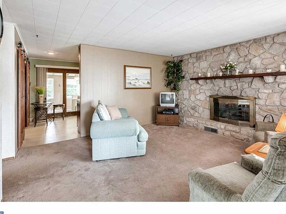 This charming three bedroom ranch home in Fairless Hills sits on a fabulous tree-lined lot, has been meticulously maintained and is fully move in ready. The excellent curb appeal is only the beginning with double wide driveway and comfortable front porch with awning. The spacious living room welcomes you in with the warmth of the wall to wall Stone vent-less gas fireplace. You'll be impressed with its neutral wall to wall carpeting, large bay window allowing for plenty of natural light, and easy flow into the lovely eat-in kitchen. The kitchen features beautiful real wood Cherry cabinets and plenty of counter space. There are 3 generously sized bedrooms with plenty of closet space. The 3rd bedroom is versatile and can also be used a dining room depending on your needs, all that is needed is unlocking the sliding barn doors!! Really cool! Also you will enjoy a 3 season room off the kitchen and the huge private backyard for entertaining! There is also a 1 Car garage perfect for additional storage along with accommodating a car. Now let's not forget the low taxes, Award Winning Pennsbury Schools, Natural Gas heat and easy access to shopping and All major road!!