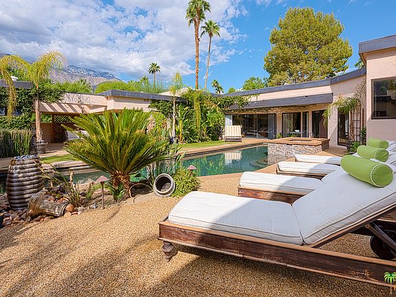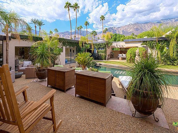 Panoramic mountain views with the quiet of Andreas Hills waits for you in this gated estate in South Palm Springs. The 6532 sq ft gated compound features resort like living with a 50' lap pool and spa waterfall, tranquil interior courtyards and gardens, lush vegetation inside and out, 3 fireplaces and a master retreat with sitting area, fireplace and two large walk in closets. The oversized living room has massive windows that take in the mountain views as well as the adjoining dining area. The remodeled kitchen features gourmet appliances, dual dishwashers and great dining area in the kitchen as well. 5 bedrooms and 6.5 baths with one suite currently being used as a media room with 150" screen and 7.1 surround sound for movie nights. The property also features an outdoor kitchen with eating area and private sauna. Recent upgrades include owned solar system, stacked stone accents in front, upgraded flooring and stacking bi-fold doors just for starters. Incredible efficient compound!