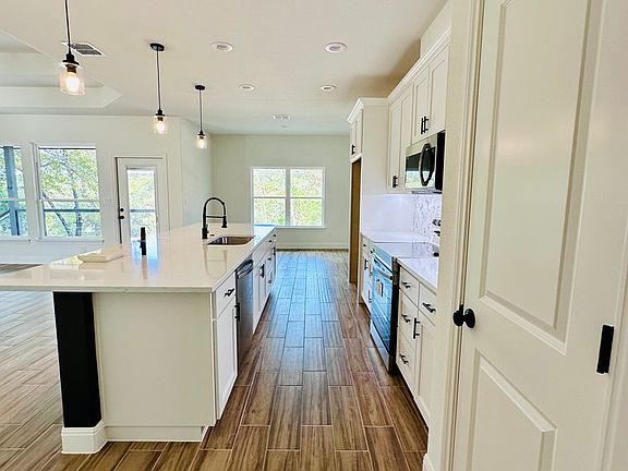 Come explore this brand new 3 bedroom 2 bath home on the bluff overlooking Rebecca Creek. It is an open floor plan with a beautiful island kitchen with tons of cabinets & under-mount lighting. There is lots of natural light throughout the home and a great view from all of the windows, especially from the rear covered porch. Bonus...there is an office that could also be the 4th bedroom. Wood look tile throughout the home, 9' ceilings in the bedrooms & office, step ceilings in both the living and primary bedroom.
