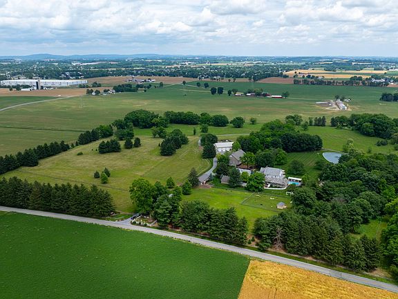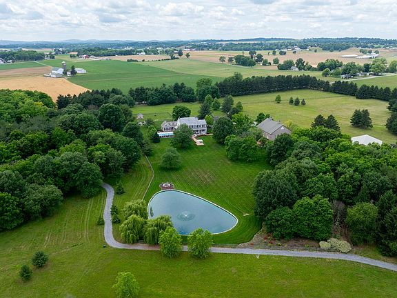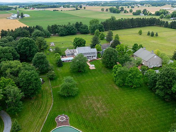 Welcome to High Cross Farm! Step back in time to a historic farm settled over 200 years ago. Two dwellings plus in-law suite, a bank barn, a pole barn, a horse barn and pastures sit on nearly 51 acres of beautiful farmland in the heart of Lancaster County. The stone farmhouse, built in 1819, has been lovingly renovated with the highest quality materials and workmanship, keeping true to period details. Original pine wood floors, graceful arches, a grand staircase, fireplaces, and vintage hardware and doors bring your senses to an era of long ago. The addition to the original home was constructed with reclaimed barn wood and stone, keeping with the time period to seamlessly blend old and new. A custom kitchen by Colonial Craft Kitchens soars with reclaimed beams in a peaked 2 1/2 story ceiling. The custom island is built from reclaimed barn wood with custom light fixtures designed specially for this space. Granite countertops, a farmhouse sink, high-end appliances, a coffee bar, and a butler’s pantry make this kitchen a cook’s dream. Three sitting areas, from casual to formal, invite family and friends to gather together for all occasions. The formal living room takes your breath away with white summer beams, a marble fireplace and built-in corner cupboard. The dining room offers another original corner cupboard and the perfect space for meals with family and friends. Upstairs, the luxurious primary bedroom and bathroom create a private haven with reclaimed wood beams in a lofty ceiling, a clawfoot soaking tub, and a designer glass shower. There are four more bedrooms and two full bathrooms, plus a second laundry on this floor. On the third floor is a spacious double bedroom and a special display of the original beam the builders used in construction. The farmhouse basement provides a movie room, personal exercise room, and a domed wine cellar. Outside, wander along the magnificent front porch to the pool and cool off in the crystal water or lounge under the pergola. Adjoining the farmhouse is a full in-law suite with a separate entrance. The home features one-floor living with an open plan kitchen and living room, and a vaulted ceiling with wood beams. There is a primary bedroom and bathroom with a handicap-equipped shower, laundry area, a walk-in closet, and an office or storage space. This bright and cheery home offers private accommodations for extended family or guests, yet is conveniently connected to the main farmhouse. The separate stone guest house was built in 1790. It has been fully renovated with four bedrooms, two full bathrooms, and a laundry. The living room, part of the original structure, includes a heated brick floor and restoration of the original hearth and beehive oven. A fully renovated bank barn provides stunning private event space. The upper level gleams with wood floors and crisscrossing beams, and is also equipped with powder rooms. The lower level houses seating for guests, a warm fireplace, and a fully-equipped kitchen. Outside is a large, brick patio for continued entertainment. The pole barn is divided into a garage, with room for RV and boat parking, and a climate-controlled workspace with an office, reception area, and powder room. The horse stable includes two horse stalls and a wash stall, and opens to fenced-in pasture. Walking trails invite you to meander to the pond with a flowing fountain, or sit around the firepit, or say hello to the animals. This picturesque, historical farm in the heart of Lancaster County blends expansive luxury living with idyllic country life.