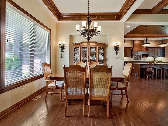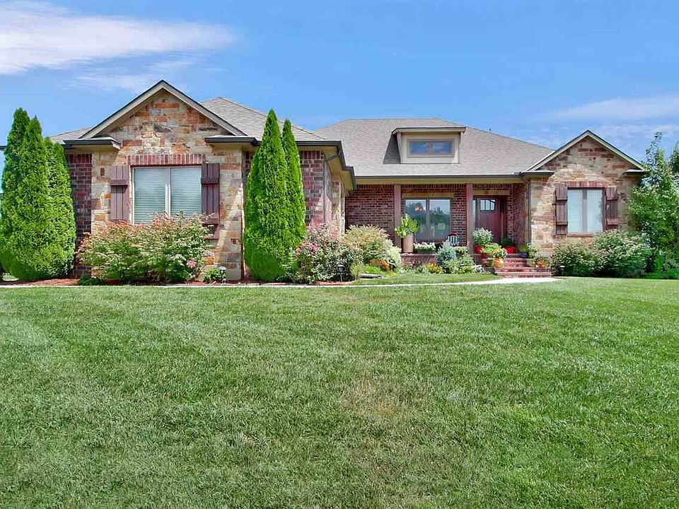 This gorgeous Craig Sharp home located in the esteemed Stonebridge neighborhood has all you have been looking for and more! So many cool features and with 5 large bedrooms, each with its own bathroom and walk-in closet, it is sure to impress. Beautiful curb appeal, with the preferred side-load garage and covered front patio, the front elevation is a definite favorite. The front door with side lites and transom window welcome you to the grand foyer with an extra special barrel cross ceiling detail and lantern chandelier. The open living space is flooded with natural light from a back wall of huge picture windows and features rich hardwood flooring and knotty alder trim throughout. A large formal dining room by the front window opens to the living room and includes a box trayed ceiling with trim and nice trimmed column. The great room is complete with coffered ceiling, floor-to-ceiling stone front gas fireplace with large mantel and solid wood custom built-in shelving. The open concept kitchen will accommodate the best including beautiful granite countertops, soft close drawers, solid knotty alder wood cabinetry, above and below cabinet lighting, gas range with custom vented hood, all Bosch stainless steel appliances, large center island, eat-in space off the kitchen with door to the covered screened in deck, huge hidden walk-in pantry and an expansive barrel statement ceiling with recessed lighting and over the island pendant lighting. A drop zone with hooks and cubbies adjacent to the large laundry room with cabinetry, folding table and sink and a powder bathroom is conveniently located adjacent to the kitchen and right inside the 3- car garage entry into the house. The master en suite includes a large spacious bedroom with a box trimmed trayed ceiling and a door to the covered, screened in deck that you can enjoy your morning coffee on. It also has a spectacular spa-like master bath, huge including an elegant soaker tub, separate full tile shower with shelves and granite corner seat, two sink vanity with gorgeous granite counter tops, tons of natural light from privacy windows, built-in desk area and an enormous master closet complete with built-in dressers. Privacy is no problem with the main floor bedrooms split from the master on the opposite side of the house each with their own full bathroom and walk-in closet. The fully finished walk-out basement features a large wet bar with space for a full size fridge and bar seating adjacent to the large family room equipped with high 9 foot ceilings, and prewired for 7.1 stereo system with six speakers on the ceiling and wall. Two additional extra-large bedrooms and two full bathrooms as well as an additional bonus room with glass French door entry can be finished to be used as a game room, exercise room or theatre room complete the lower level. The beautiful landscaping, rod iron fence, sprinkler system and irrigation well are a few exterior amenities as well. Sedgwick county taxes and Andover schools, this home truly has all that you've been looking for! Call to schedule your private showing today.