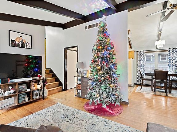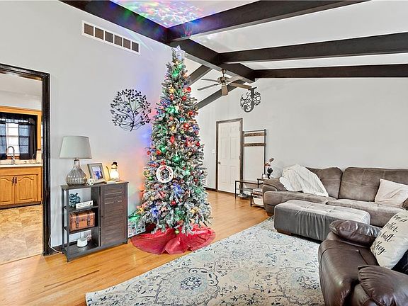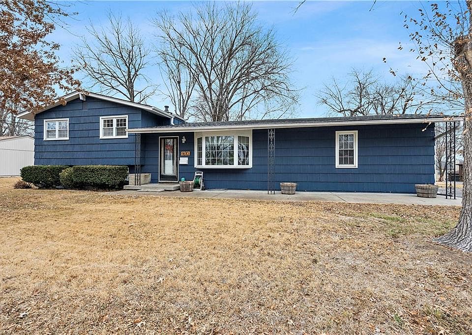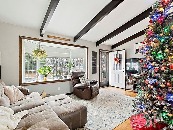This 3 bedroom 2 bathroom side split home located in a quiet neighborhood on a large corner lot in Gladstone might be just what you're looking for! As soon as you step in you will notice the gorgeous beamed vaulted ceiling, hardwood flooring and a large bay window. Head up a few steps to find a large primary bedroom and two more bedrooms all covered in hardwood flooring, and a beautiful updated full bathroom. There is plenty of space to spread out in the basement family room with a wood burning fireplace and another full updated bathroom. The family room walks out to a covered patio, perfect for family barbecues and a large privacy fenced backyard. This well cared for home has it all- convenient location, plenty of space inside and out, quaint and charming, and might just be perfect for your family. Come see for yourself!