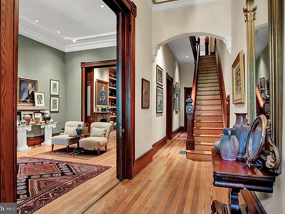 One of the "Grandest Dames" in historic Bolton Hill awaits you here. Superb location overlooking a sylvan park, and its soothing historic fountain. Handsome architectural detail abounds throughout - Oversized crown moulding, pocket doors, elegant ceiling medallions, 13 ft ceilings on 1st and 2nd floor, and dramatic recessed lighting in many rooms. 8 marble mantels - 1 wood burning and 2 gas fireplaces (all fireplaces "as-is") Fantastic custom kitchen/family room with full bath and access to a lush terraced courtyard with enchanting water features. 3 zone forced hot air and air conditioning with programmable thermostats. 3 Fabulous porches with original fretwork and expansive city views span the back of the house. Five bedrooms, 4 1/2 baths, heated floors in primary bath with separate tub and shower. 2 car parking pad. An exceptional blend of old world charm and urbane sophistication - a rare and exemplary offering indeed!