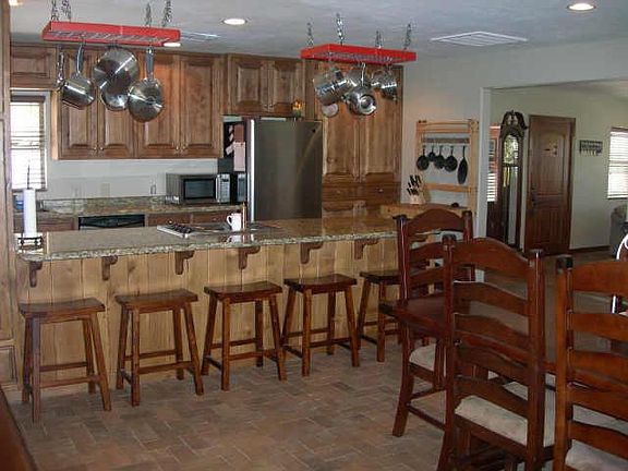 QUALITY RANCH STYLE HOME THAT SITS ON ALMOST 1 ACRE ON TOP OF HILL WITH AWESOME VIEWS. HOME HAS BEEN CUSTOM REMODELED BY ALVIN HANCOCK & SON`S; QUALITY IS HIGHEND. OPEN FLOOR PLAN WITH 9` PLUS CEILINGS. BRICK FLOOR THROUGHOUT HOME. CUSTOM ALDER WOOD CABINETS & CLOSETS. LARGE SHELVED STORAGE ROOM. GRANITE COUNTER TOPS IN KITCHEN WITH ALL THE AMENITIES, DOUBLE OVENS, TWO POT HANGERS. STAINLESS STEEL APPLIANCES. LARGE KITCHEN COUNTER/SITS 7 PLUS.FIREPLACE IN DINING ROOM/FAMILY ROOM. MASTER HAS TILED WALKIN SHOWER.MASTER HAS EXIT TO COVERED PATIO. BEAMED WOOD PORCHES-FRONT & BACK THAT EXTEND ENTIRE LENGTH OF HOME. ABOVE GROUND SPA.ROOM TO BUILD GARAGE, GUEST HOUSE, OR POOL.