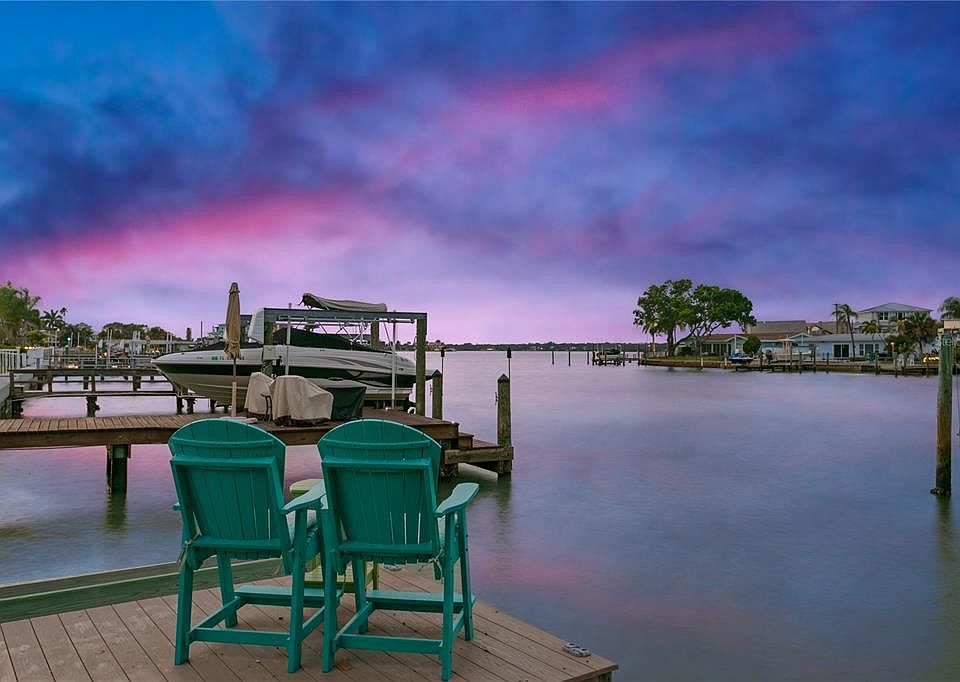 AMAZING PRICE REDUCTION...Four blocks to the Gulf of Mexico and the lovely Redington Beach is this beautiful cozy waterfront retreat. Boasting a true 3 bedroom 2 bath home with GARAGE AND POOL (2009), this home should accommodate most everyone. Everything about this home is open and inviting. From the moment you pull into the large circle driveway providing plenty of parking for friends and family to when just a few steps into the home you are greeted by the sight of the waterfront and the rooms bathed in sunlight. The expansive kitchen is the focal point of the home. ALL NEW CABINETS (2021), QUARTZ COUNTERTOPS (2021), marble back splash to ceiling, (2021) ALL NEWER APPLIANCES INCLUDING TWO OVENS (2021) and fixtures. Whether night or day you are drawn to the outside. The new ARTIFICIAL TURF (2022) and FENCE (2022) adorning the pool makes this home feel like a resort. The composite dock offers breathtaking views, connection to wild life such as dolphins and herons, sometimes a partial sunset and private beach at low tide, a great fishing spot and a perfect place to launch or keep a paddle board or kayak. There have been many upgrades to the home, paint inside and out(2020 and some 2023), new baseboards, quarter round and some drywall (2021), new Epoxy Garage Floor, (2021),HVAC(2020)WATER HEATER(2019), NEWER BATHROOM VANITIES, COUNTERTOPS AND FIXTURES(2021 and 2023), new flooring in 2 bedrooms, NEW POOL PUMP AND CHLORINATOR, NEWER WASHER AND DRYER(2021), NEW GUTTERS (2022) WATER FILTRATION SYSTEM with monthly service(2021) IF YOU DECIDE TO RENT IT SHORT TERM OR LONG TERM, use as vacation spot or enjoy all year, the home has many peace of mind entities that can convey or be negotiated so you can enjoy right away. Redington Beach has a lot to offer such as special beach parking permits, events at Friendship Park and many restaurants.