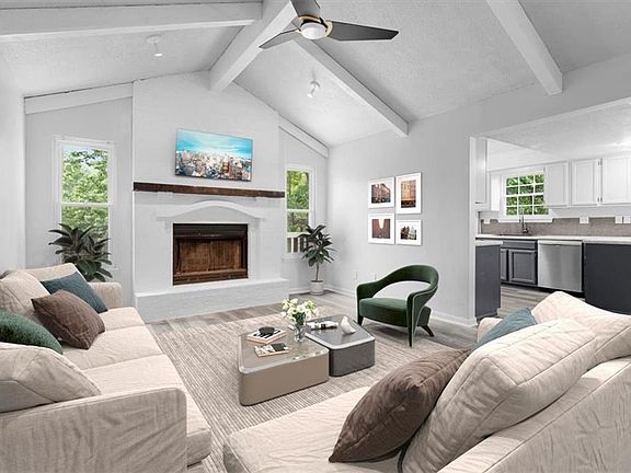 Inside the home, you'll find a charming dining room with bay windows, a living room with a fireplace and cathedral ceiling, and new double-hung replacement windows throughout. The home has been updated with trendy finishes and colors.