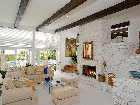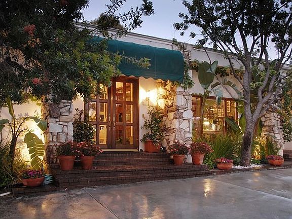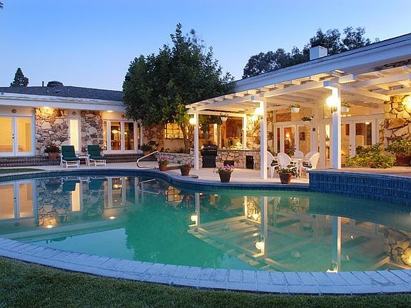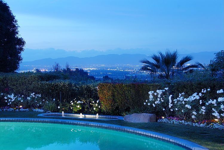 If you are looking for a home that takes your breath away, a home with the "wow" factor, look no further! Uniquely situated providing both panoramic Valley views and incredible sunset views. Nestled behind gates up a private driveway, you'll find this contemporary mid-century 1-story estate. Special features include a large library, magnificent formal living and dining rooms surrounded by glass highlighted by a white rock fireplace, black granite gourmet kitchen with stainless steel appliances, comfortable family room equipped with an entertainment center and fireplace, spacious master suite along with a gym and sauna, and an outdoor barbecue/kitchen. The pool area is an entertainer's delight day or night. Bordered by a rose garden and lawn is the exquisite fountain and endless views beyond from the tiered patio.