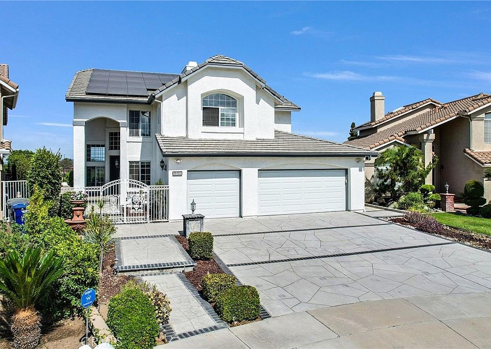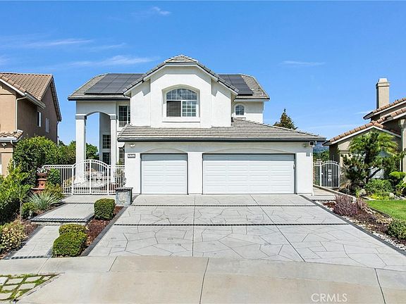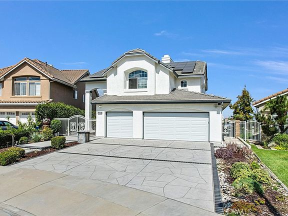 INCREDEBLE VIEWS! Phenomenal, beautiful and peaceful setting! Nestled almost at the top of the hill in a PRIME secluded location, it is a fantastic opportunity to live in a very exclusive area. Spectacular designer's executive two story home located in the prestigious Hillsborough "Manors" community. It's a "10", best of the best. Built by William Lyon homes; spotless, quality throughout that words cannot describe! A TRUE PRIDE OF OWNERSHIP! Four bedrooms and 3 bathrooms. Tremendous curb appeal in a small cul-de-sac location. Enter through a large gated, very private front courtyard, to a double door entry. Privacy, space and elegance abound in this executive home: it offers a grand entrance with dramatic cathedral ceilings, fabulous open layout, perfectly suited for today's lifestyle with easy flows. Warmth and charm surround you everywhere with beautiful upgrades. Current owners maintained the property in impeccable, immaculate, condition. Lots of windows make this property extremely light, bright and airy. Gorgeous engineered wood and Travertine flooring downstairs, crown molding, recessed lighting, ceiling fan. Main floor bedroom (now used as an office) and bathroom, impressive formal living room, large formal dining room with French door leading to the back yard. Gourmet kitchen boasts granite countertops, tile backsplash, upgraded cabinets, solarium windows, stainless steel/black appliances & breakfast nook. Upscale family room with upgraded fireplace and wet bar are the perfect spot for enjoying family & friends. Elegant primary suite with vaulted ceilings, romantic fireplace, a resort style luxurious bathroom (soaking tub & separate shower), dual sinks, his/hers mirrored-doors walk-in closets and a balcony for enjoying breathtaking and forever CITY LIGHTS, HILLS AND MOUNTAIN VIEWS. All 3 bathrooms have been upgraded/remodeled; handy laundry room downstair; 3-car attached garage. Gorgeously landscaped grounds; private and large rear yard with nice patio cover and extra large side yard for perfect outdoor entertaining while enjoying the built-in fire pit. HOA has low Association dues ($140/month) and it offers community pool, spa and clubhouse. Near Los Coyotes Country Club, Westridge Golf Course and the 105-acre Clark Regional Park! Also, close to the Westrigde Plaza and the La Habra Marketplace, grocery markets, restaurants, transportation and golf courses. FULLY PAID FOR (not a lease) solar PV System means YOU WILL SAVE ON ELECTRICITY BILLS!
