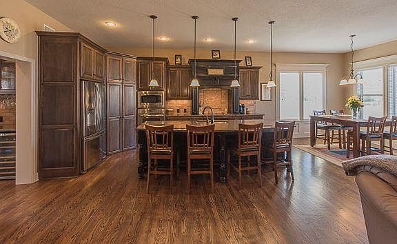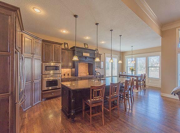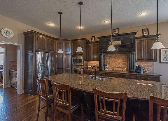 Immaculate, like-new 1.5 story home sits on cul-de-sac & backs to green space. Open floor plan w/soaring ceilings. All granite kitchen w/large island & walk-in pantry. See-through fireplace w/ electric ignitor. All 5 bedrooms boast walk-in closets. Butlers pantry. Laundry room conveniently located off master closet on main level. Mud room off garage. Large Covered deck w/fan & fireplace. Huge finished walk-out basement w/tray ceiling, granite wet bar, and room for pool table. Large patio off basement. Fenced yard. Don't miss this stunning home! Basement prewired for surround sound. Beautifully landscaped yard with perennials and sprinkler system. Dining room w/tray ceiling & hardwood floors on the diagonal. Exceptional mouldings and ceiling treatments throughout. All neutral colors. Upgrades galore!