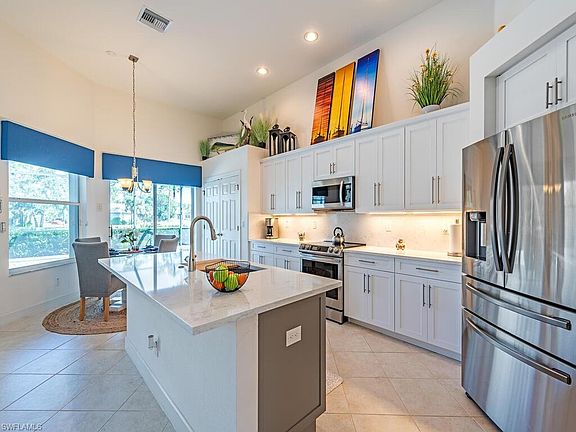 Sparkling lake views from this beautifully updated single family home with pool and spa in Delasol. Recently remodeled kitchen features white cabinets, crown molding, quartz counters, single farm sink and newer stainless appliances. Open great room plan combines kitchen and living areas, with separate formal dining room. Soaring high ceilings with trays in dining and master. Spacious lanai overlooking pool/spa area with beautiful lake views. Pool deck recently painted, LED lights, pool automation/wifi connect, and outdoor kitchen create an incredible outdoor living space. Oversized 3 car garage with 4 foot extension and air conditioning. New carpet in guest rooms and office, plantation shutters, new tile roof in 2021, garage AC in 2023, and electric shutters at entry and rear lanai. Numerous upgrades throughout, and meticulously maintained! Delasol is a gated community with a fantastic location in North Naples, with Clubhouse, resort style pool/spa, tennis, pickleball, kids play area, basketball, event room, and fitness center, all for very reasonable fees.