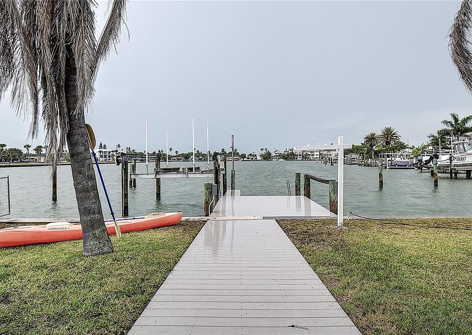 Major Price Improvement! Sunset views over the protected Redington Beach lagoon, quick access to the intercoastal and Gulf, remodeled home-this one has it all!! Spacious waterfront 4 bedroom, 3 bathroom open floor plan. $125k Upgrades in 2021 including KITCHEN, MASTER BATHROOM, ELECTRICAL PANEL, NEW HURRICANE WINDORS/SLIDERS, AND PLUMBING. NEW ROOF AUG 2023. As you enter the home, huge living room/great room with direct MILLION DOLLAR waterfront views is much larger than expected from the curbside. Features include sweeping protected waterfront views, composite dock for your boat, interior laundry, a beautiful kitchen and a 3 way split bedroom plan for lots of privacy. The serene blue/gray color reminds you of your beachy location. Note the master bedroom and newer ensuite bathroom are on the water with direct access to the rear exterior yard and screened porch. The screened porch is aluminum framed/faced with wood, spanning the entire width of the home; electrical access and plumbing for a hot tub are a bonus. The western rear exposure allows for spectacular sunset views over the lagoon; boating, kayaking, paddle boarding, jet skiing and enjoyment of all boating activities as well as marine life. The composite dock/pilings and remote control lift were replaced in 2015 and has housed boats ranging from 15ft to 30ft. The protected water/lagoon location just off of the causeway allows quick access to the Gulf with no fixed bridges. Oversized (60ft x 115ft), shaded lot has a fenced rear yard and room for a pool. Redington Beach is small beach town with private access/beach parking. Enjoy the coastal lifestyle with this home and wait no more!