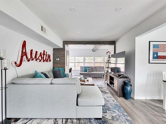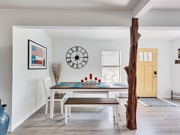 Experience the perfect blend of modern updates and natural, beachy charm in this refreshing 2BD/2BA home nestled in a serene Lake Travis neighborhood. This beautifully renovated property features a bright and tasteful open floor plan, showcasing unique wood craftsmanship throughout. The home is equipped with custom blinds and overhead LED wafer lighting, and laminate floors throughout, with tile in the bathrooms ensuring a carpet-free environment. The living room layout includes a sunroom that fills the space with natural light. The sun-filled Owner’s Suite opens through French doors onto a large covered private deck and boasts a huge walk-in closet with custom shelving. The luxurious ensuite bathroom has been recently updated with a new vanity, tile, and a shower with a custom glass door. The Guest Bathroom features subway tile walls and backsplash. Step outside to a huge covered wood deck with exposed beams, ideal for outdoor living and dining. The yard is an outdoor oasis, featuring patio seating under the stars, well-maintained landscaping, shade trees, and French drains. Additional outdoor features include an outdoor cabana with a workshop/storage area, extended metal roofing, and a covered patio area with electrical connection and cement slab, ideal for a hot tub or conversion into an outdoor kitchen and game area. There is also an additional barn storage shed. This unique private oasis also grants access to a Boat Ramp at Sail & Ski Yacht Club. Additional property upgrades include a new electric panel, new french doors in the primary bedroom, and new septic system. Don’t miss out on this incredible opportunity to own a Lake Travis cottage that perfectly blends modern elegance with a beachy, natural vibe.