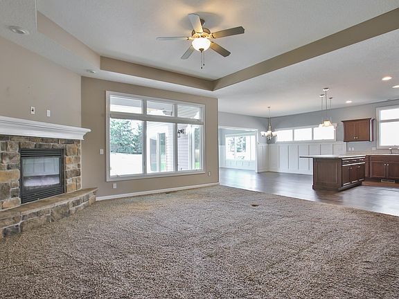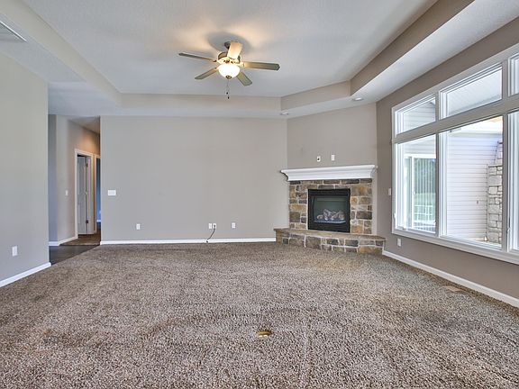 Unique Floor Plan with Stunning Outdoor Space! This exceptional home features a spacious covered back patio courtyard with skylights and an outdoor fireplace, perfect for entertaining. Step into the expansive Great Room, where a cozy corner fireplace and soaring 10' step ceiling create a welcoming atmosphere. The open layout seamlessly connects to a center island kitchen, complete with a two-sided breakfast bar and a bright 17' x 12' sun room. The kitchen boasts a walk-in pantry for all your storage needs. The master suite is designed for comfort, featuring 3' wide doors, a walk-in shower, and a private patio doors leading to the serene outdoor courtyard. Enjoy added privacy with lovely pine trees lining the backyard. This home truly has it all, including a charming nook and sunroom for relaxing moments!