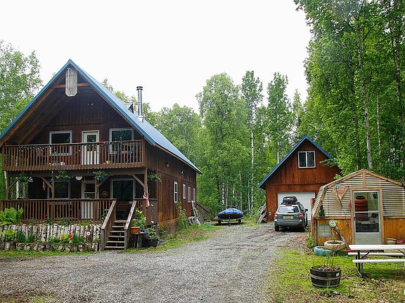 Across from Sunshine Lake in Talkeetna this home has over 2000 sq.ft. of spacious living. Lower level has an open kitchen/living room, large bedroom and bath, the upper level has 2 huge rooms (could easily be 3 bedrooms) with 1/2 bath and a unique catwalk to the upper deck.Having double decks are nice for entertaining. Have a green thumb?There is a greenhouse to grow your vegetables and flowers.