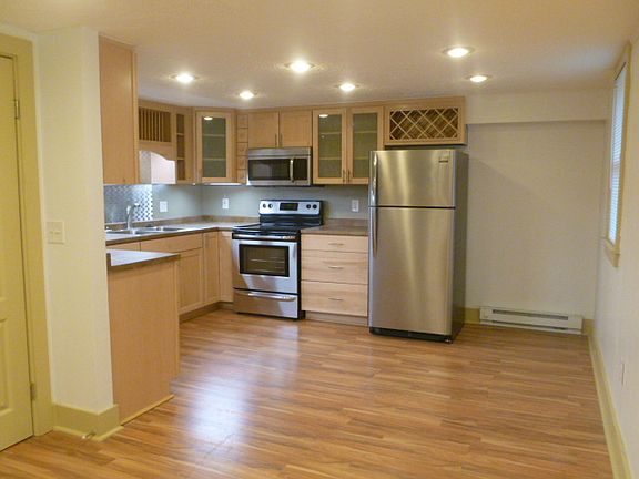 Bright one bedroom, one bath walk-out lower level apartment in duplex. All completely remodeled 2 yrs ago with stainless appliances, tile, upgraded cabinetry. Unit comes with stacked w/d, good storage, including unfinished storage closet, large closet in living room, and 2 closets in bedroom. There is a beautiful built-in shelving/desk unit. Walk to UVa. Washer and Dryer in unit. Rent includes lawn maintenance