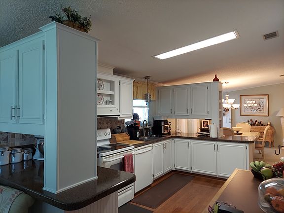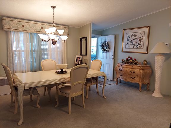 A 1993 3 bedroom 2 bath Palm Harbor for sale. This beautiful interior lot home offers 1646 square feet of living space with a split floor plan. The living and dining rooms are carpeted with crown molding and ceiling fans. In the kitchen, you will find laminate flooring, newly resurfaced counter tops and freshly painted cabinets and a cozy breakfast nook area with the separate laundry room. Both guest bedrooms have reach in closets and ceiling fans with the full guest bathroom located between them. The master bedroom is carpeted with a walk in closet. Master bathroom sports a tiled walk in shower, dual vanity, ceramic tile flooring and plenty of linen storage. There are thermopane windows and faux slat blinds throughout the home The spacious lanai contains ac, glass windows, and Berber carpet to enjoy that first morning cup of coffee or a glass of wine at the end of the day. The large driveway and carpet has plenty of space for 2 vehicles and a sitting area. A new AC was installed in 2019 and a new roof in 2021. This home is being offered partially furnished with a golf cart. Don't let this warm and inviting home slip through your fingers, schedule your appointed today!