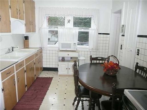 Lots of different options for this house! Currently zoned as 2 family! Better used as single family with potential in home office or in law apartment! 1st floor has bedroom, liv rm, eat-in kit, enclosed front porch, nice natural gumwood trim and rear enclosed porch w/sliding glass door. Second floor has large eat-in kit, 1 bedroom, liv rm w/walkin closets, 2nd floor deck and then 2 bedrooms up on the 3rd floor! Ceramic tile front foyer entry! Front and rear staircases to the 2nd floor! Hardwood floors thru-out! Partially fin basement! 2 car detached garage with turnaround blacktop driveway!