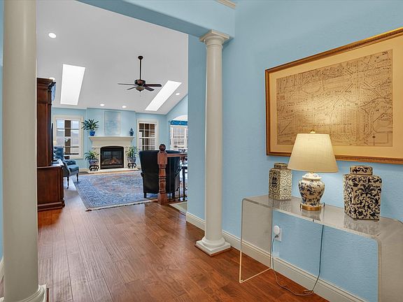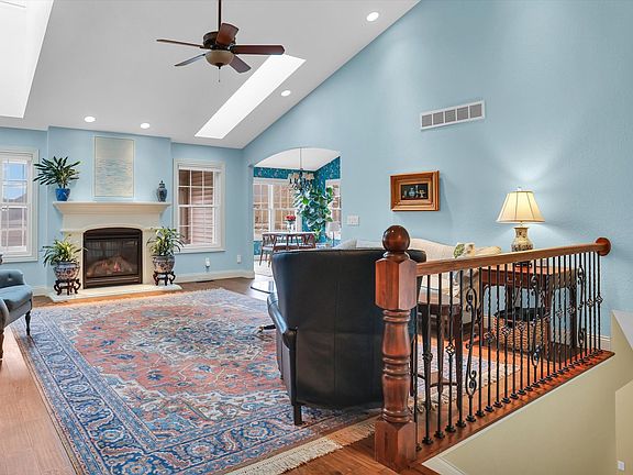 Experience this stunning zero-lot home, perfectly situated on the water in the desirable Liberty on the Lake subdivision. Step into the spacious living room, where soaring vaulted ceilings, two expansive skylights, and hardwood floors create a bright and inviting ambiance. The open-concept kitchen features sleek granite countertops, stainless steel appliances, a gas range with a convenient pot filler, and a hot water tap. The adjoining dining area makes entertaining effortless. Retreat to the main-floor primary suite, where water views, a stylish tray ceiling, and a generous walk-in closet await. The spa-like ensuite bathroom offers dual vanities, a whirlpool tub, a separate shower, and luxurious heated floors. A second bedroom and full bath complete the main level. The home provides plenty of storage throughout, including the sunlit basement. Designed for entertainment, the basement features a kitchenette with a wine cooler, a spacious family room, a dedicated theater room, and an additional bedroom with a full bath-perfect for guests or extended stays. Enjoy lake views from the enclosed porch and the fenced backyard. A great opportunity for easy, waterfront living in a sought-after location.