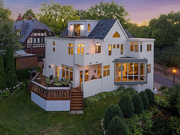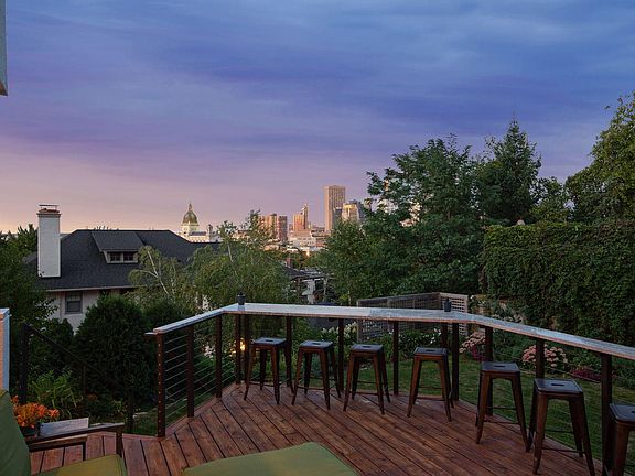 Remarkable Lowry Hill 2.5 Story overlooking the Minneapolis Skyline. Recently remodeled with thoughtful finishes. Inviting grand entry with gleaming natural red birch hardwood floors that open up to the formal living room featuring a double sided gas fireplace. The formal dining room showcases the spectacular views from the floor to ceiling windows. Stunning eat-in kitchen that walks out to wrap around deck making it great for entertaining! Light filled with walls of windows and tall ceilings throughout. Featuring 3 bedrooms on the upper level with a 4th bedroom on the 3rd floor with a balcony offering stunning panoramic skyline views. Beautiful primary suite with private balcony, vaulted ceilings, walk-in closet, laundry and full bathroom. Rare 3+ car garage. Perched on tree lined street on a beautifully landscaped private lot. Prime location that is minutes from downtown!