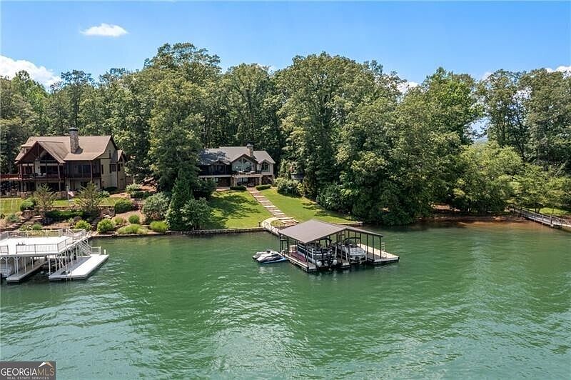 Introducing a stunning waterfront retreat at 1611 Heathers Cove Rd, Hiawassee, GA - a newly listed, architecturally designed gem nestled beautifully with breathtaking views of the Appalachian Mountains. This exquisite property, masterfully renovated by designer Mike Swilley and Jerry Kyle Construction, spans a generously appointed landscape with top-tier finishes and remarkable attention to detail. Enter through an inviting foyer that seamlessly transitions into a vaulted family room adorned with century-old Indiana beams and a cozy fireplace. The home boasts a chef's dream kitchen with vaulted ceilings and equipped with integrated Subzero appliances, superb marble countertops, and a secondary scullery. Comfort and luxury define the main-level master suite, featuring a romantic fireplace, awe-inspiring views, and an ensuite bath complete with a large shower, soaking tub, heated floors, and double marble vanities. Additional accommodations include a guest suite with a luxury bath on the main floor, alongside practical spaces such as a study, laundry, and half-bath. The hardwood-covered main level flooring and shiplap walls lead to a terrace level that enhances living with a large family room, equipped with a wet bar with subzero refrigeration and freezer drawers, two additional guest suites with ensuite baths, and another half-bath. Travertine floors add to the ambience. Exterior features include an expansive outdoor living area with a fireside porch, sun deck, grilling area, and a stone patio complete with a hot tub, fire pit, and bed swings. The custom-covered dock offers two boat slips with lifts and jet ski pads. Home is situated on a deep water lot. Additional features of the home include a whole house generator, Control 4 system, tankless water heaters, motorized screens, irrigation system, custom window treatments, security system, storage building, and circular driveway. This property is a must see and is conveniently located, providing both serene isolation and access to community amenities. Perfect for those seeking a luxurious, peaceful lifestyle by the water. Experience the epitome of lakeside living in this magnificent Hiawassee home.