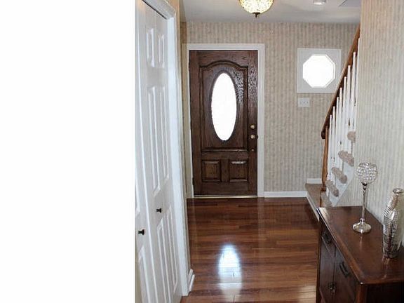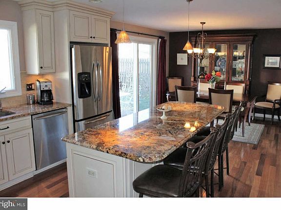 Magnificent, beautifully updated, move-in ready 4 bedroom 2 1/2 bath colonial has pride of ownership plus!! Enter thru the center hall (with double coat closet), and step back into the gorgeous, granite and stainless kitchen with amazing, oversized breakfast bar with pretty hanging pendant lights (as well as much recessed lighting), large window over the sink for even more light, awesome flat-top stove, lovely ceramic tile backsplash and kitchen even includes the stainless refrigerator and a built-in wine frig under the island. Kitchen is completely open to dining area with sliders convenient to rear patio, great for back yard barbeques too. The spacious living room has an amazing view of the town thru the large bow window (all windows and doors have been updated). Beautiful Brazilian Teak hardwood floors through-out the first floor. Super convenient first-floor powder room has lovely ceramic tile flooring and is also completely updated as well with a beautiful pedestal sink and lovely fixtures. Steps to 2nd floor and all bedrooms/hallway boast brand new carpeting. Beautiful, updated hall bath has wainscoting, new fixtures and beautiful flooring. Linen closet is in hallway adjacent to hall bath. Spacious master bedroom also has it's own fabulous ceramic tile bath with shower, newer vanity and fixtures. The 2nd floor includes 3 additional bedrooms. Basement is finished with fresh paint and new carpet and even includes a wet bar. There is storage under the steps, newer hot water heater and laundry room has utility sink too. There is plenty of room for extra storage in this unfinished portion of the basement. In 2007 the now maintenance-free exterior was resided, beautiful stone work done and even gutters and roof were installed/updated. This house is in impeccable condition! Pride of ownership shines thru so put this one at the top of your list! This home will never last!
