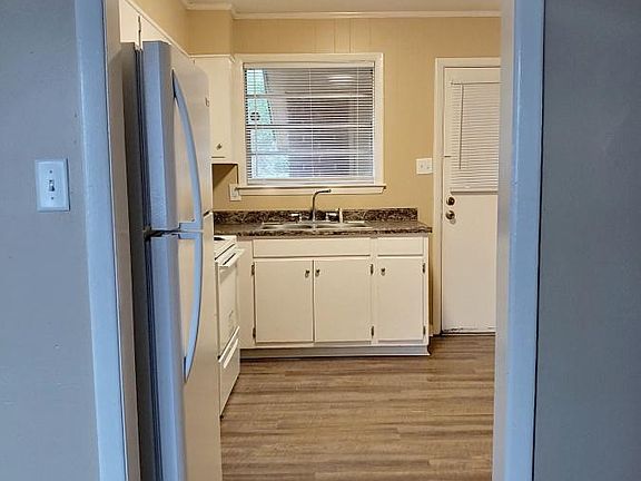 This 2 bedroom 1 bath duplex has vinyl plank flooring with mini blinds throughout. Kitchen has updated countertops plus a stove and refrigerator. Laundry room is off the back porch and comes with washer and dryer hook ups. Utilities are tenants responsibility. Lawn care is included.