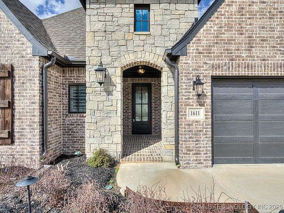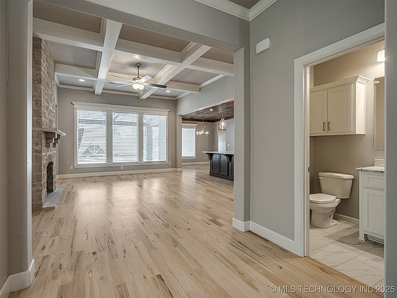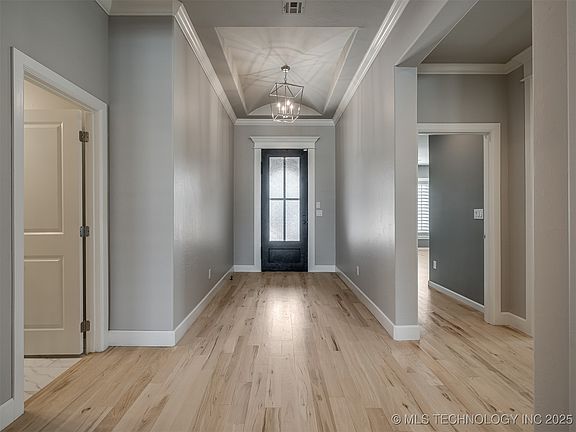 Numerous amenities make this Hickory Creek home truly one of a kind! Enjoy this one story home in a fantastic gated community (Jenks Schools) near Hwy 75/Creek Turnpike. The striking wrought iron front door opens to a flexible floor plan of 2,876 SF with abundant natural light, gorgeous white oak wood floors and groin ceiling. Main living area features a coffered ceiling and stone fireplace surrounded by built-in cabinetry and shelves.