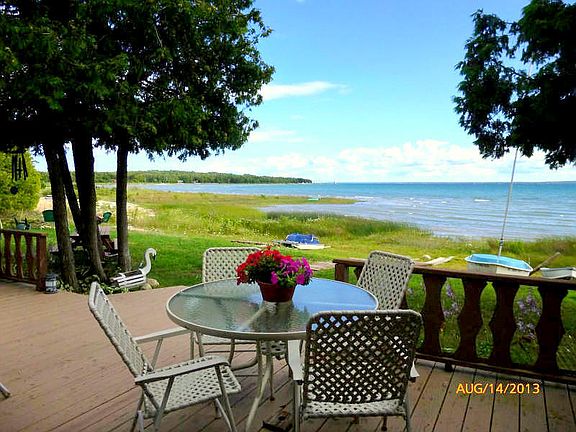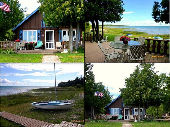 This adorable bridge view chalet-style Lake Michigan cottage is situated on 140 feet of frontage, just 5 miles west of the Mackinac Bridge. The main level features 2 bedrooms, laundry area, and kitchen/dining room/living room with fireplace & vaulted ceiling. The upper loft sleeps the overflow. Great front deck and attached outside sleeping hut with Murphy bed (reading and napping spot of choice). This property shouts "Up North" and is a great place to base all your northern adventures from. 5 min. west to Sand Dunes beaches, North Country Trails+, and 5 mi. east to historic St. Ignace/region.