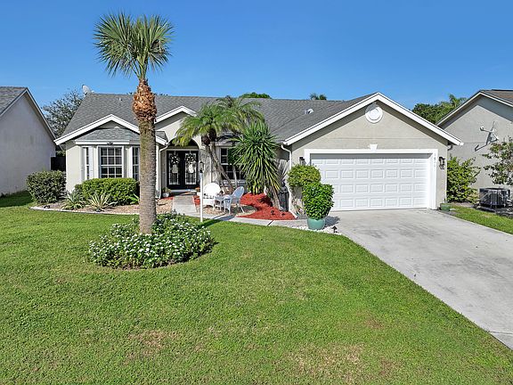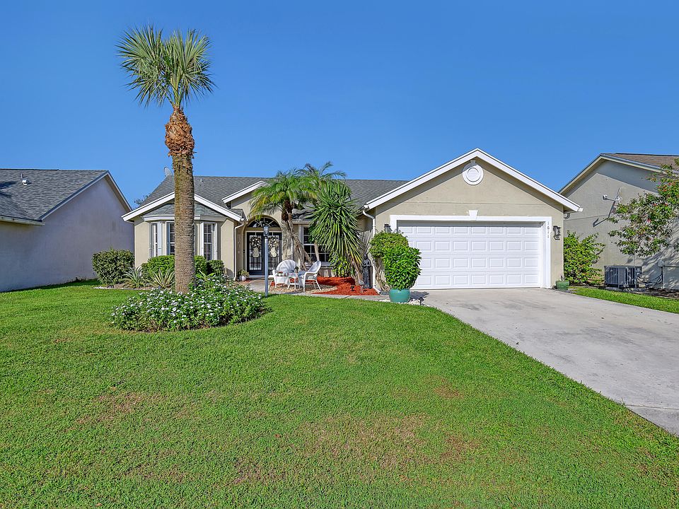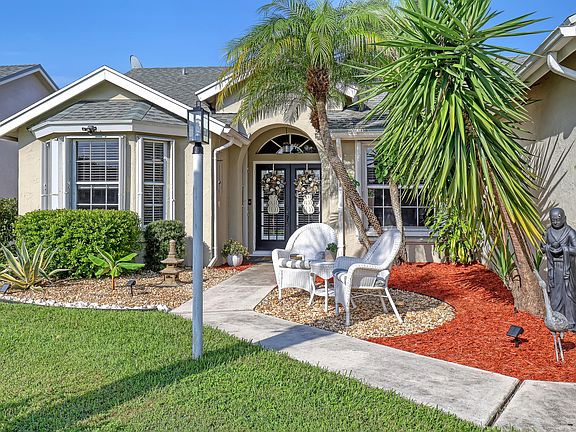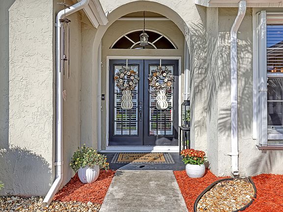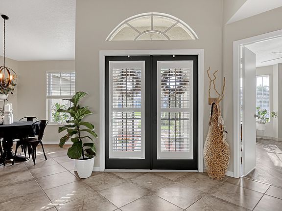Step into this immaculate 3-bedroom, 2-bath CBS home, where warmth and charm welcome you from the moment you enter through the elegant double doors with plantation shutters. The thoughtfully designed split floor plan offers vaulted ceilings that create a spacious, open feel throughout the home. The kitchen, equipped with newer stainless steel appliances, ample counter space, and cabinets, overlooks the formal dining room, living room, cozy eat-in nook, and the backyard, making it perfect for entertaining.The primary suite boasts a luxurious bathroom featuring double sinks, a separate tub, and a walk-in shower. Enjoy outdoor living in the fully fenced backyard, complete with ambient lighting and a large wood deck--ideal for gatherings or peaceful stargazing. Additional features include accordion hurricane shutters, a newer A/C unit, and a two-car garage. Located in a quaint gated community, residents can enjoy amenities such as a heated pool, clubhouse, and boat ramp for non-gas water vessels with access to Lake Wellington, the largest lake in the Village.
