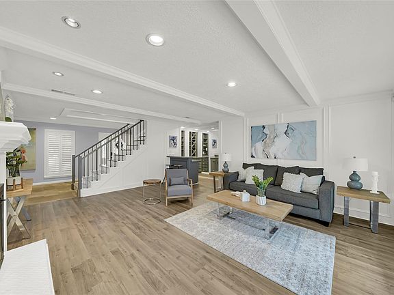 Modern eleganceStylish new flooringExpansive deckingLuxurious quartz countertopsRefinished built-in barStunning renovated staircase