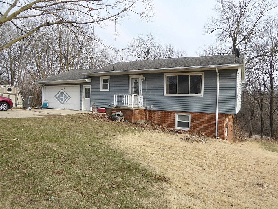 Investor or home flipper Alert! Nestled between East Dubuque and Galena, check out this brick and steel sided 4 bedroom, 2 bath, 2 car garage home on 2+ acres minutes from East Dubuque. The home features a lower level family room with a wood burning fireplace, deck and shed on a wooded lot. Some repairs and TLC required. Known issues included but are not limited to: Garage foundation is cracked and displaced (see photo); Broken rafters above garage; Garage floor is cracked and displaced. This property is being sold As-is. Call your Realtor today for a showing!
