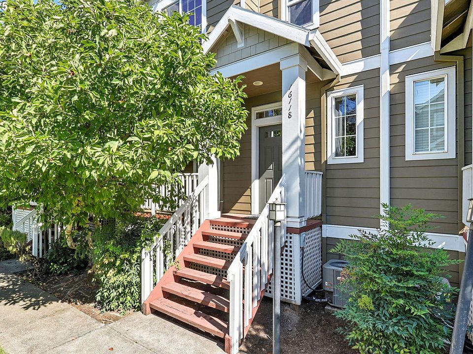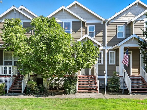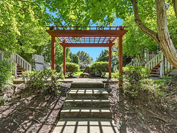 One super-cool thing about THIS townhome is the lush and beautifully landscaped courtyard entrance, a rare feature in an urban location. Enjoy a green view from the covered front porch and living room (many townhomes overlook the parking lot!) Upgraded interior space features BRAND NEW CARPETING up the stairs, and the entire upper level. High ceilings and towering vaults in the TWO "ensuite" bedrooms are crowned with handsome ceiling fans. Oversized bedroom closets - the primary has two closets! Handy upstairs laundry, too. The kitchen's ceramic tile flooring, timeless "butcher-block" wood island and white subway tile backsplash create a quality, classic look. Bonus room on the lower level is ideal for extra work-space, exercise, game room or an additional family room. The 2-car attached garage has roomy, easy street access. Central location is "very bike-able." Affordable, comfortable living in this plum, southwest Portland location awaits.