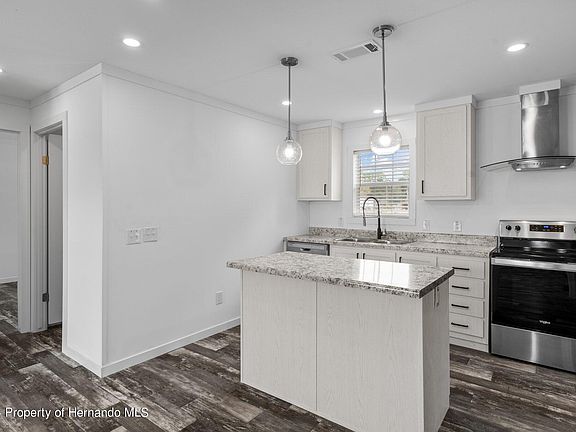 (Active under contract. Accepting backup offers.)... OPPORTUNITY AWAITS! BACK ON MARKET DUE BUYER PERSONAL ISSUE... Pride of ownership already shows on this new home, beautifully situated on your own land! Spacious double-wide home with split floor plan, sheetrock walls. Home also offers a modern kitchen with kitchen island, stainless steel appliances including ice maker refrigerator with water/ice dispenser, dishwasher, built-in microwave oven and glass top stove; large great room; large master bedroom suite with private bath; two additional bedrooms with shared bath; and a separate laundry room. Your entire home is carpet free for easy maintenance. Upgrades also include additional LED lighting in kitchen, 40' overhead cabinets, Stone Crest range hood, deep kitchen sink and goose neck faucet, pendant lights on kitchen island, trimmed bath mirrors, second sink in master bedroom, elongated toilets, window blinds, fans in most areas, USB outlet, bath fan timers, aluminum gutters, USB wrap, insulation package, split AC system and a manufacturer's 7-years warranty!! Large parking pad and mostly fenced. Sod and trees newly planted with sprinklers in place. Spacious, fenced-in back yard. Location is extremely convenient to shopping, restaurants, schools and Suncoast Parkway providing access to Tampa and airport in less than 45 minutes. Public transportation within easy walking distance. No HOA, CDD or lot rent fees. FHA and VA accepted.