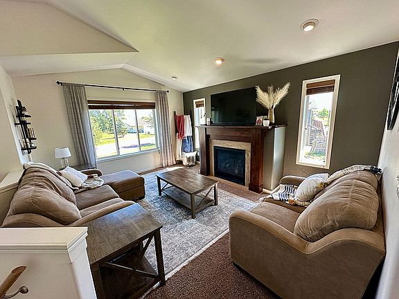 Step inside to a spacious kitchen featuring a large island, brand-new countertops, stainless steel appliances including a brand new refrigerator, abundant cabinetry, and a pantry — all flowing seamlessly to the covered deck, perfect for outdoor dining and relaxing. The living room offers comfort with its cozy gas fireplace and oversized window, filling the space with natural light.
