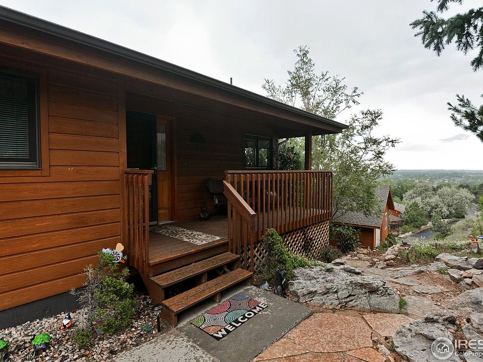 Awesome, well maintained home perched on hillside overlooking city. Breathtaking panoramic views. Multiple private decks perfect for entertaining or enjoying quiet moment w/ morning coffee. Spacious open floor plan w/ lots of natural light. Features kitchen island w/ gas cooktop, wood floors, walk out basement, wet bar & beautiful rock outcoppings. Double lot with amazing detached garage... room for cars, toys & workshop. Lower level could be wonderful art studio w/ shelving & gas fireplace.