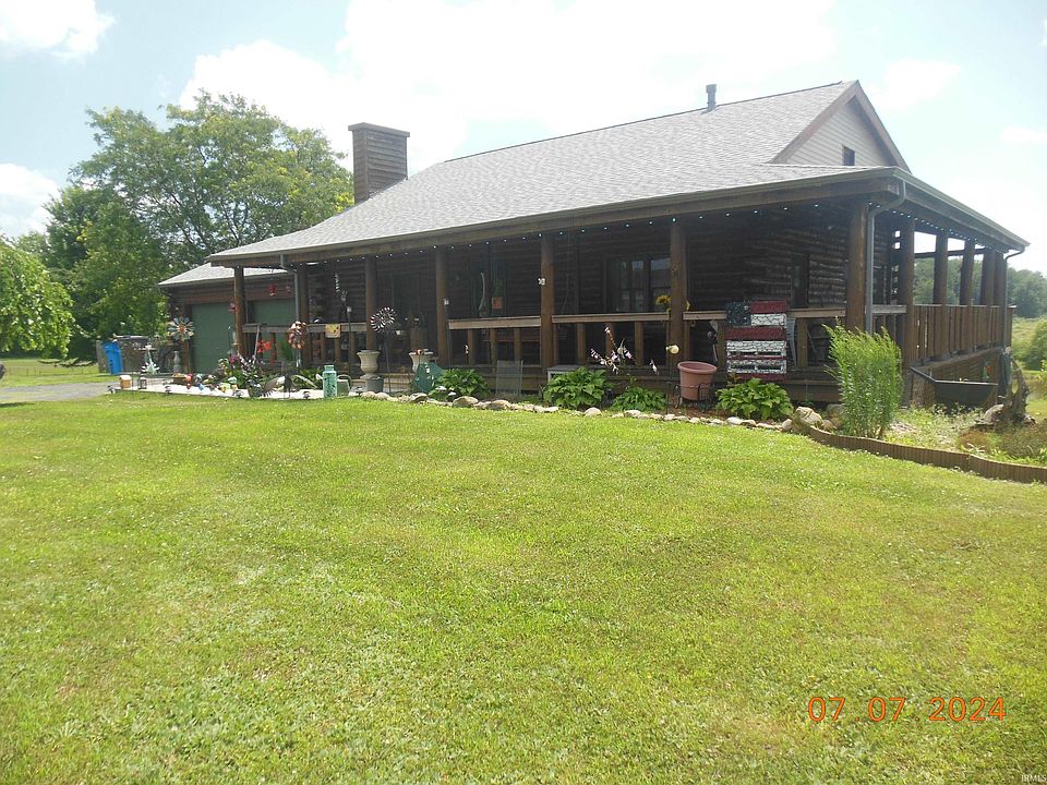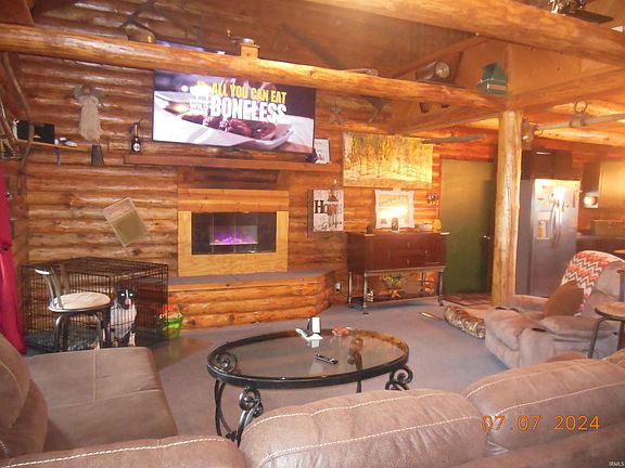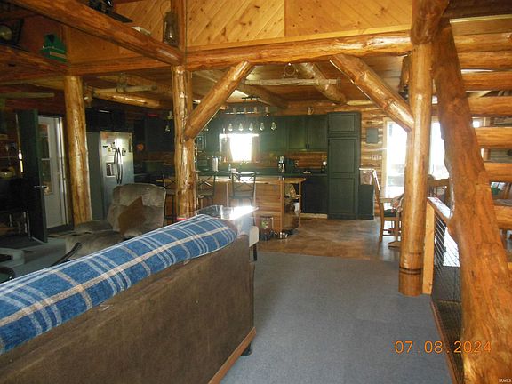 This a a unique log cabin style home with many great features. Wonderful wrap around porch starts in the front, wraps around east side all the way to the back deck that overlooks the pond (stocked with fish, along with some turtles, frogs and don't forget the beautiful dragonflies). Not only do you have access to the back deck off the kitchen/dining room BUT you also have walk out on the lower level from the family room to the back yard. There are 3 unique bedrooms (1 on each floor) upper level is a master suite with jacuzzi tub, new walk-in shower and closet. Main level is open concept living, dining and kitchen with an island. The bedroom can hold 2 queen beds and still have room for a large dresser and more. Main floor also has a full bath and a separate laundry room. Not only is there an oversized 2 car attached garage BUT there is a threesome of sheds (a he shed, a she shed and one for the lawn equipment). AND there is more, a parking pad at the side of the driveway that will hold at least 4 vehicles. Call for your showing today before this one gets away.