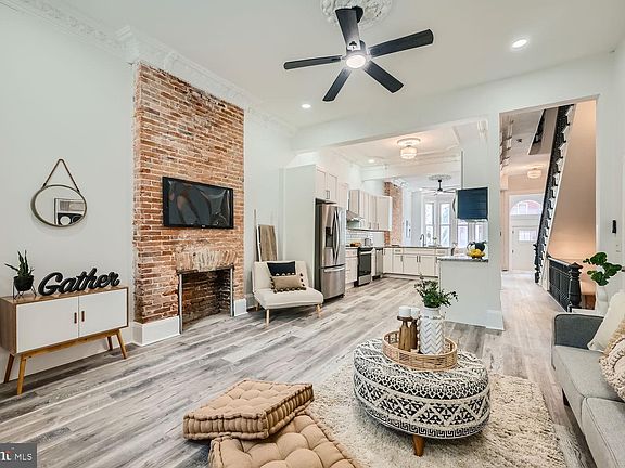 A stunning transformation has taken place behind the door of this classic Baltimore townhome offering four floors of newly remodeled living space. This 5BR/4.5BA home boasts tons of original character beginning with the ceiling height, the medallions on the ceiling, detailed crown moldings, exposed brick, and open staircase.  Step into your forever home offering tons of natural light from the stunning bowed windows on each floor, luxury flooring throughout, and plenty of living space.  The main floor offers the open concept floor plan homeowners are seeking with a spacious dining room, centered kitchen, and family room. The kitchen offers plenty of cabinets, stainless steel appliances including a slide-in range with stainless vent hood, granite countertops with a subway tiled backsplash, and a deep stainless sink set into a peninsula overlooking the dining room with breakfast seating for two. Just beyond the family room is a mudroom with a half bath.  Take the stunning open wood railed staircase to the second floor offering two primary sized bedrooms, one with a large walk-in closet and a private en suite with a walk-in shower, the other with a private full bath. Continue on to the third floor also offering two primary sized bedrooms both with private bathrooms, one with a walk-in shower.  On the finished lower level is additional living space as a potential 5th bedroom, laundry, and storage. From the mudroom step out onto a large wood deck that overlooks a fenced yard with tons of possibilities.  This home is move-in ready with so much to offer new homeowners and is located in close proximity to shopping, restaurants, and commuter routes.