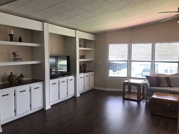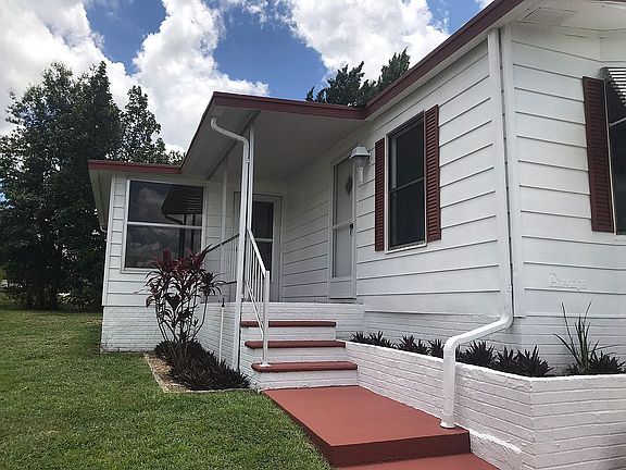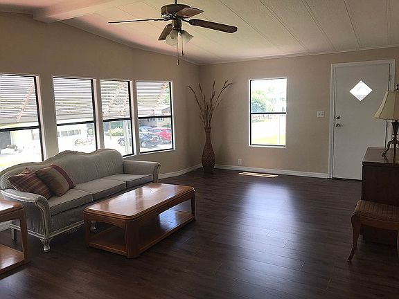 Open house Tuesday June 7th 11 AM - 2 PM (Please use a mask when visiting). Built in the 1980s, this 1344 square foot Prestige manufactured home was recently renovated and is in move-in condition. Unlike most manufactured homes, this one includes ownership of the lot, so there is NO LAND RENT. HOA fee is only $55 per month! The floor plan includes a family room with wet bar that is open to the kitchen with an island that has electric outlets and a breakfast bar. The separate living room extends the entire front of the home and has built-in storage cabinets and counter space to store and showcase your collectibles. New good-quality water-resistant laminate flooring has been installed throughout and there is tile in the bathrooms. The master bedroom has a walk-in closet with a private bathroom that includes a step-in shower, dual sinks, washer/dryer enclosure and closet space. The smaller bedroom has its own bathroom with bathtub. New range, over-the-range microwave and dishwasher. Refrigerator is functional but should be replaced. We tried to order a new counter depth one but it couldn’t be shipped soon enough. You'll enjoy the spacious Florida room with newly installed tile and original glass windows as well as a separate screened patio, plus a spacious workshop for crafts or gardening. New roof was installed in 2021. Air conditioning unit is 7 years old and works great. The house has a five year subscription for termite prophylaxis as termites are endemic to this area. The very active, friendly and well-run community of Foxwood Lake Estates includes a clubhouse, pool, spa, shuffleboard, pickle ball court, walking trail, pond with dock and much more.