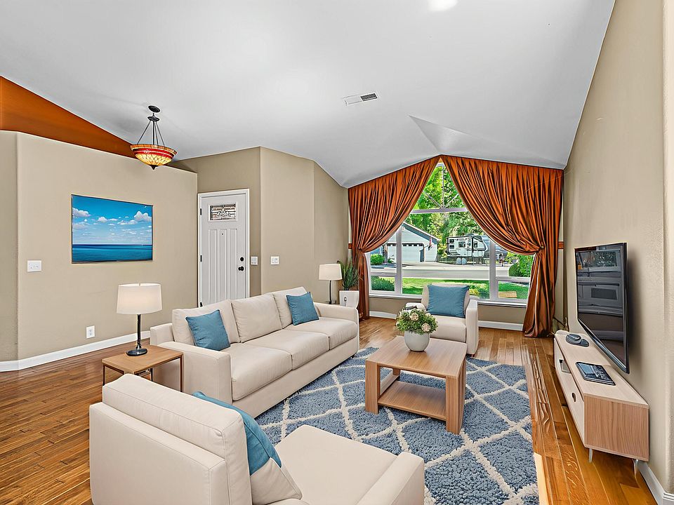 Peaceful and private home in a quiet Lone Pine neighborhood! On a calm street with virtually no through-traffic and a spacious floor plan, this home is a tranquil escape. Vaulted ceilings and floor-to-ceiling pictures windows and transom windows immerse the living room in natural light, with a peninsula fireplace to set a cozy mood in the living room and dining room. The kitchen boasts ample storage, a gas range, and a free-flowing layout open to the breakfast nook and dining room showing off the unique architectural highlights. The primary bedroom features more vaulted ceilings, a generous ensuite bathroom with a soaking tub, and private access to the covered back patio. Well established, low maintenance landscaping and mature trees provide ample shade and create a sense of solitude, plus small RV parking and a sizable storage shed along the side of the house.