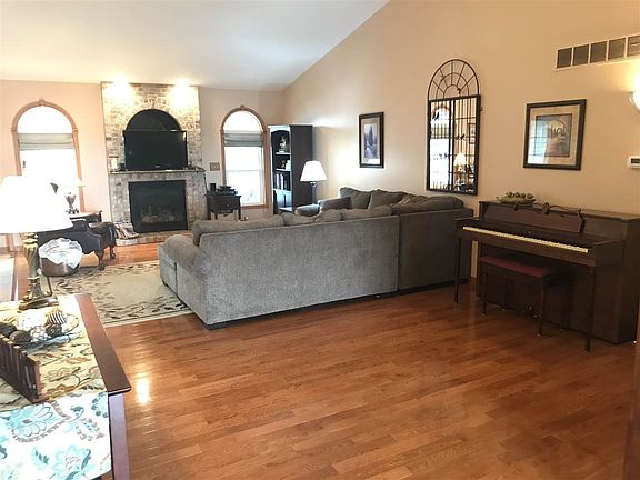 Impeccably maintained and quality built 3 bedroom ranch home in Trails Edge across from Lahood Park. Well designed with large dining area and slider to mature landscaped rear yard. Retractable awning over patio. Huge basement with workshop, rec area, and lots of storage. Brick front, stamped concrete drive, vinyl fenced yard. Updates include roof, siding and gutters, flooring, AC, interior paint and more!