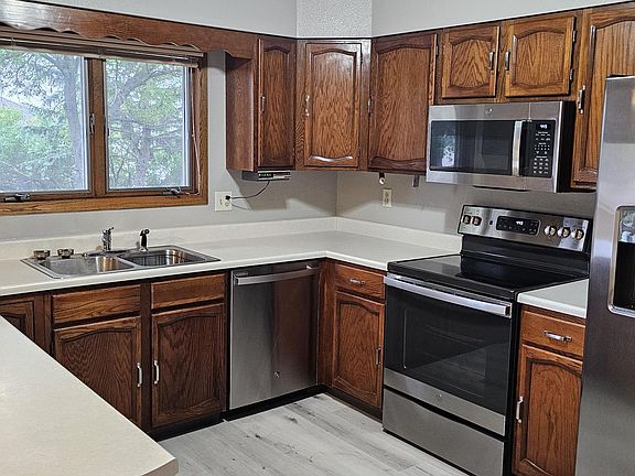 Interior features include newer furnace, new flooring throughout upper level (and in lower bath), large dining area, dual sinks in main floor bathroom, lower level gas fireplace, newer kitchen appliances and much more!