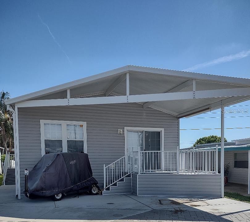 Open Concept Living and High Ceilings make this 2016 Model light and airy, with a Single Family home feel. This is a 2 Bedroom, 2 Bath Manufactured Home in the highly desired, active 55+ Trailer Estates community. A large covered front porch adds indoor/outdoor living space. Kitchen is open with ample cabinets, stainless steel appliances and a breakfast bar/island. Master Bedroom has ensuite bath with dual sinks and a large walk-in closet. Inside Laundry. Private rear patio for grilling and gathering with family and friends. Wide oversized carport. You own the land. Boaters have direct access to Sarasota Bay from the Marina. Enjoy the large, heated community pool, hot tub, gym and wood shop. The community buzzes with pickleball, shuffleboard, kayaking, horseshoes, bocce, dancing and more. A US Post Office on site. 10 minutes to Sarasota-Bradenton Int'l Airport. Convenient to shopping, restaurants, the Arts and everything Bradenton/Sarasota has to offer. Make this your forever home or snowbird hideaway!