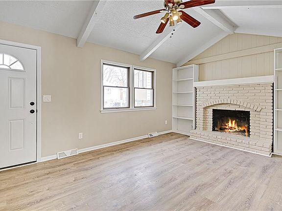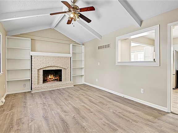 Step inside to an inviting open-concept living area featuring vaulted ceilings with exposed beams, a stunning brick fireplace, and built-in shelves, all complemented by light wood look flooring and large windows that flood the space with natural light. The modern kitchen shines with white cabinetry, including stainless steel refrigerator and oven. Convenient pass-through to the living area, making it ideal for entertaining.