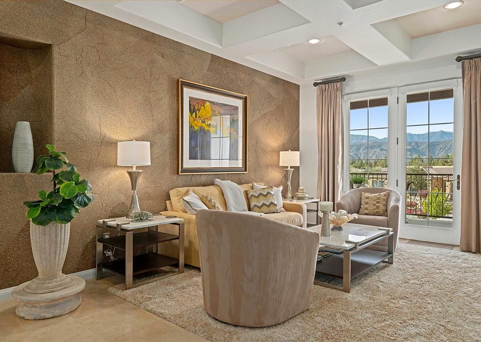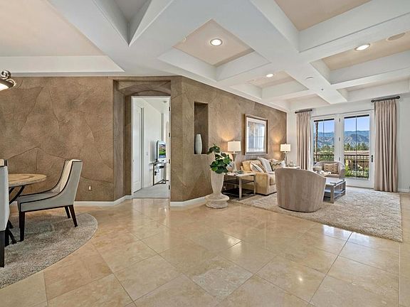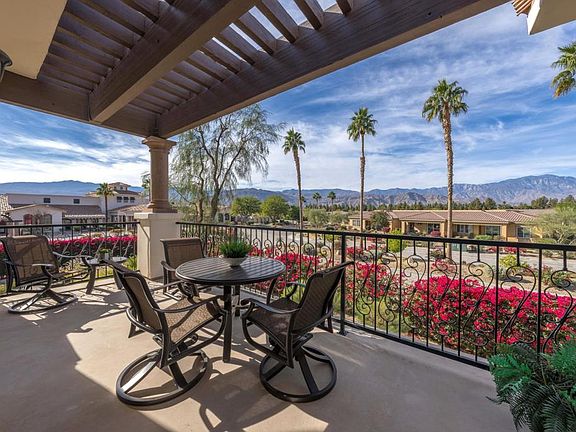 Welcome to Villa Portofino: A Premiere 55+ Active Adult Community in the Heart of Palm Desert. 1612 Via San Martino is situated in one of the most ideal locations within the community. The elevated private patio, which spans living room to primary bedroom, offers access to a tranquil experience with stunning, panoramic views of the San Jacinto Mountains and its unobstructed sunsets; all framed in Bougainvillea. Inside, this remodeled and pristine 2-bedroom, 2-bathroom + den or office condominium is offered furnished and move-in ready. Features include: Striking coffered ceilings, travertine floors, gas fireplace, cook's kitchen with granite slab countertops and new Kitchen-Aid stainless steel gas range and microwave, new Miele washer & dryer, and an ideal separation of bedrooms. Access includes both elevator and stairs options. Location is just steps to the 30,000 sq. ft. clubhouse which features a movie theater, restaurant & bar, Olympic sized pool & lap pool, fitness center & yoga studio,9-hole putting green, and endless activities from bridge to bingo, ensuring a vibrant community life. Located near shopping and entertainment, 1612 VSM isn't just a home; it's a lifestyle destination. HOA dues cover gated access, cable, Internet, water, gas, insurance, roofs, and maintenance of common areas