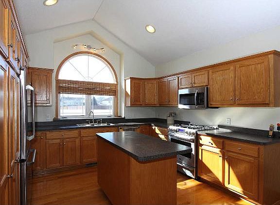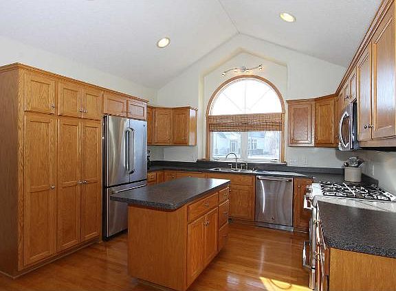 Executive multi-level. Gracious kitchen w/ample cabinetry, center prep island, stainless appliances, hardwood floors, vaulted ceilings. 12ft high ceilings in great room w/ 3-sided stone fireplace. Private fenced patio, landscaped yards w/ sprinkler system, Directions Hwy 169 to Cty Rd 18, S to SouthBridge Pkwy, W to Windsor Dr, South to property